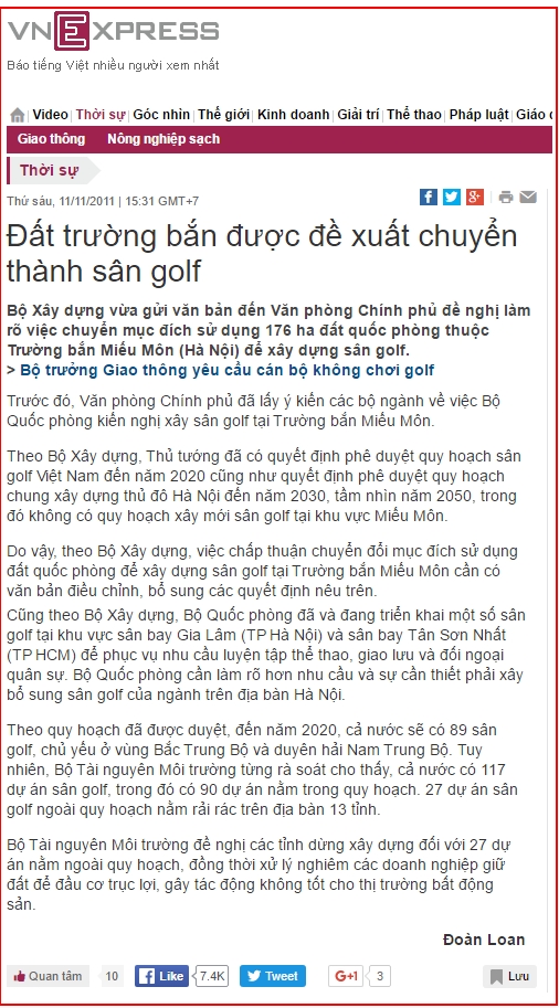 Bài báo viết về việc chuyển 179 ha đất Quốc phòng để xây dựng sân Golf ở Miếu môn ( Hà Nội)