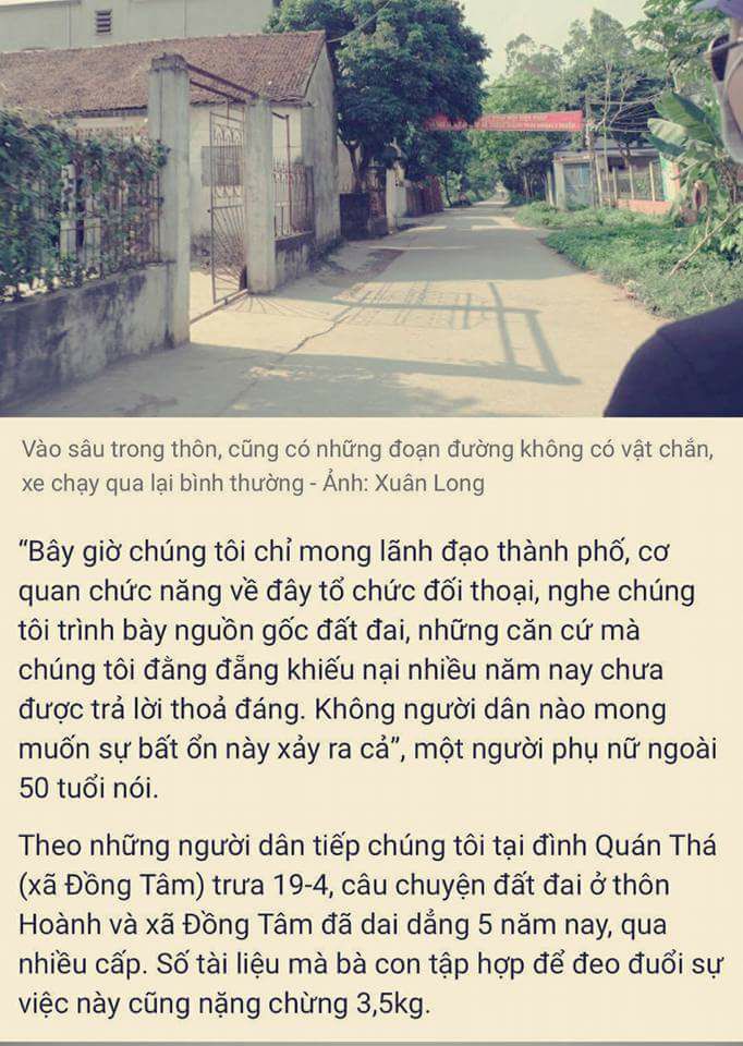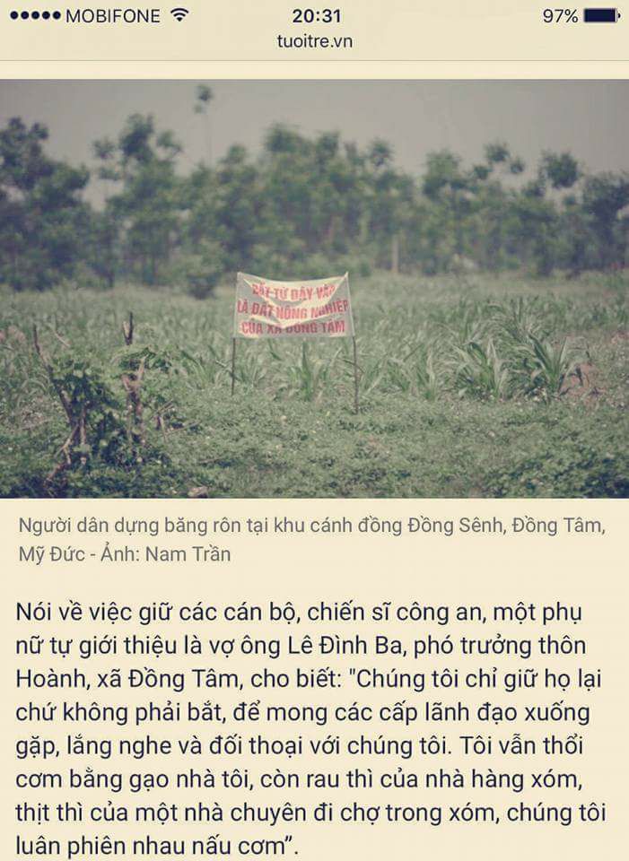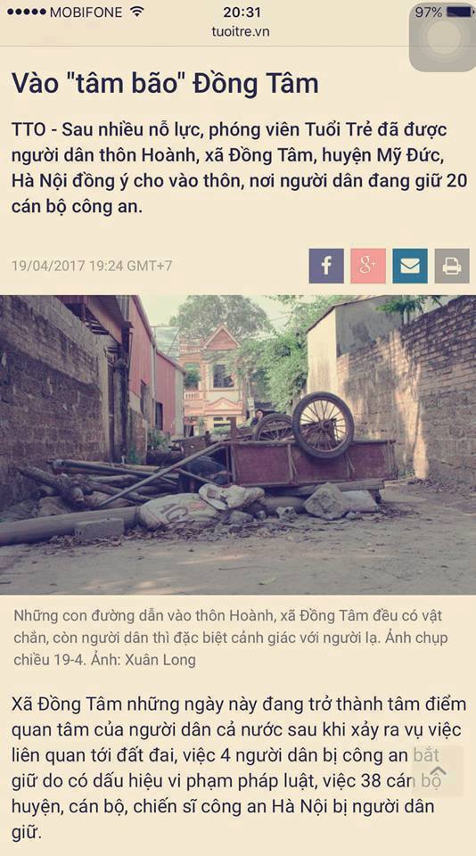 Vào tối nay, lúc 19:24 Tuổi Trẻ có đưa lên online bài ghi nhận từ Đồng Tâm, tuy nhiên 20 phút sau đó bị buộc gỡ; còn bản mang đi in báo giấy ngày mai phải dẹp giờ cuối. Post lại đây.