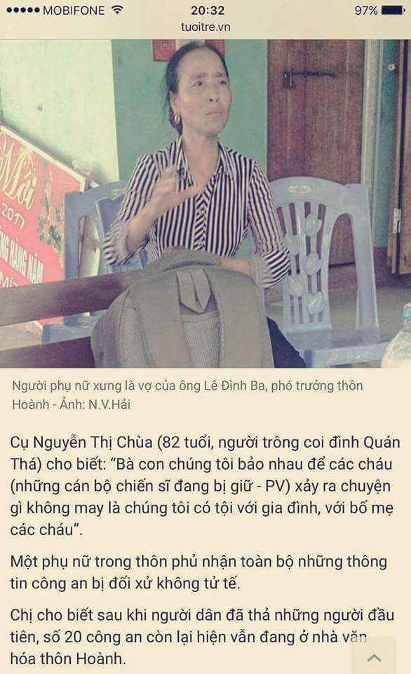 Cụ Nguyễn Thị Chùa (82 tuổi, người trông coi đình Quán Thá) cho biết: “Bà con chúng tôi bảo nhau để các cháu (những cán bộ chiến sĩ đang bị giữ – PV) xảy ra chuyện gì không may là chúng tôi có tội với gia đình, với bố mẹ các cháu”.