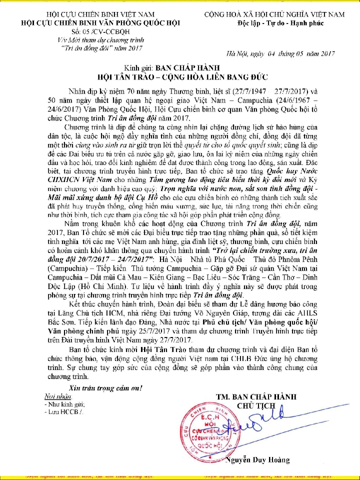 Nhân dịp kỷ niệm 70 năm ngày Thương binh, Liệt sỹ Việt Nam (27.07. 1947 – 27.07.2017 ) và 50 năm ngày thiết lập quan hệ ngoại giao Việt Nam – Campuchia ( 24.06.1967 – 24.06.2017 ) Hội Tân Trào tại CHLB Đức nhận được thư mời tham dự chương trình „ TRI ÂN ĐỒNG ĐỘI „ do Văn Phòng Quốc Hội, Hội Cựu chiến binh Văn phòng Quốc Hội tổ chức .