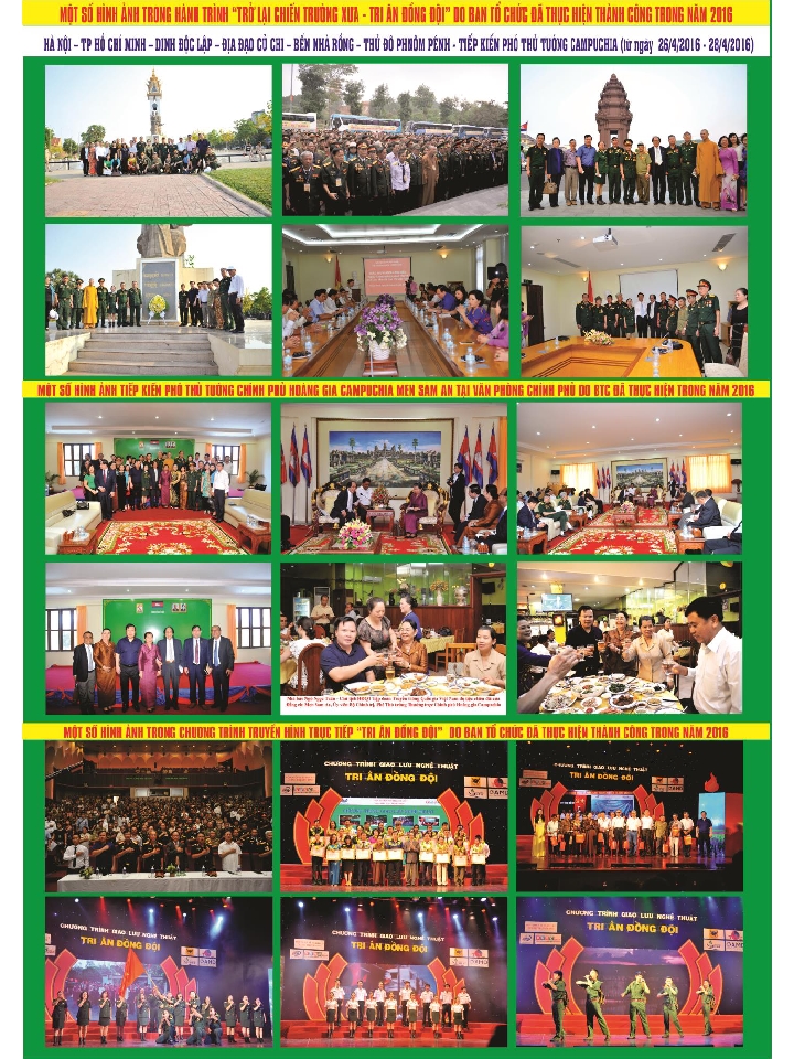 Nằm trong khuôn khổ các hoạt động của chương trình „ Tri ân đồng đội 2017 „ với hành trình „ Trở lại chiến trường xưa – Tri ân đồng đội „ Ban tổ chức sẽ mời các đại biểu trực tiếp trao tặng những phần quà, sổ tiết kiệm tình nghĩa tới các mẹ Việt Nam anh hùng, gia đình liệt sỹ, thương binh, cựu chiến binh có hoàn cảnh khó khăn thông qua hành trình „ Trở lại chiến trường xưa , tri ân đồng đội 20.07.2017 – 24.7.2017 „: Hà Nội – Nhà tù Phú Quốc – Thủ đô Phnôm Pênh ( Campuchia ) – Tiếp kiến Thủ tướng Campuchia – Gặp gỡ Đại sứ quán Việt Nam tại Campuchia – Đất mũi Cà Mau – Kiên Giang – Bạc Liêu – Sóc Trăng – Cần Thơ – Dinh Độc lập ( T.P Hồ Chí Minh ). Tư liệu về hành trình đầy ý nghĩa này sẽ được phát trong phóng sự tại chương trình truyền hình trực tiếp Tri ân đồng đội.