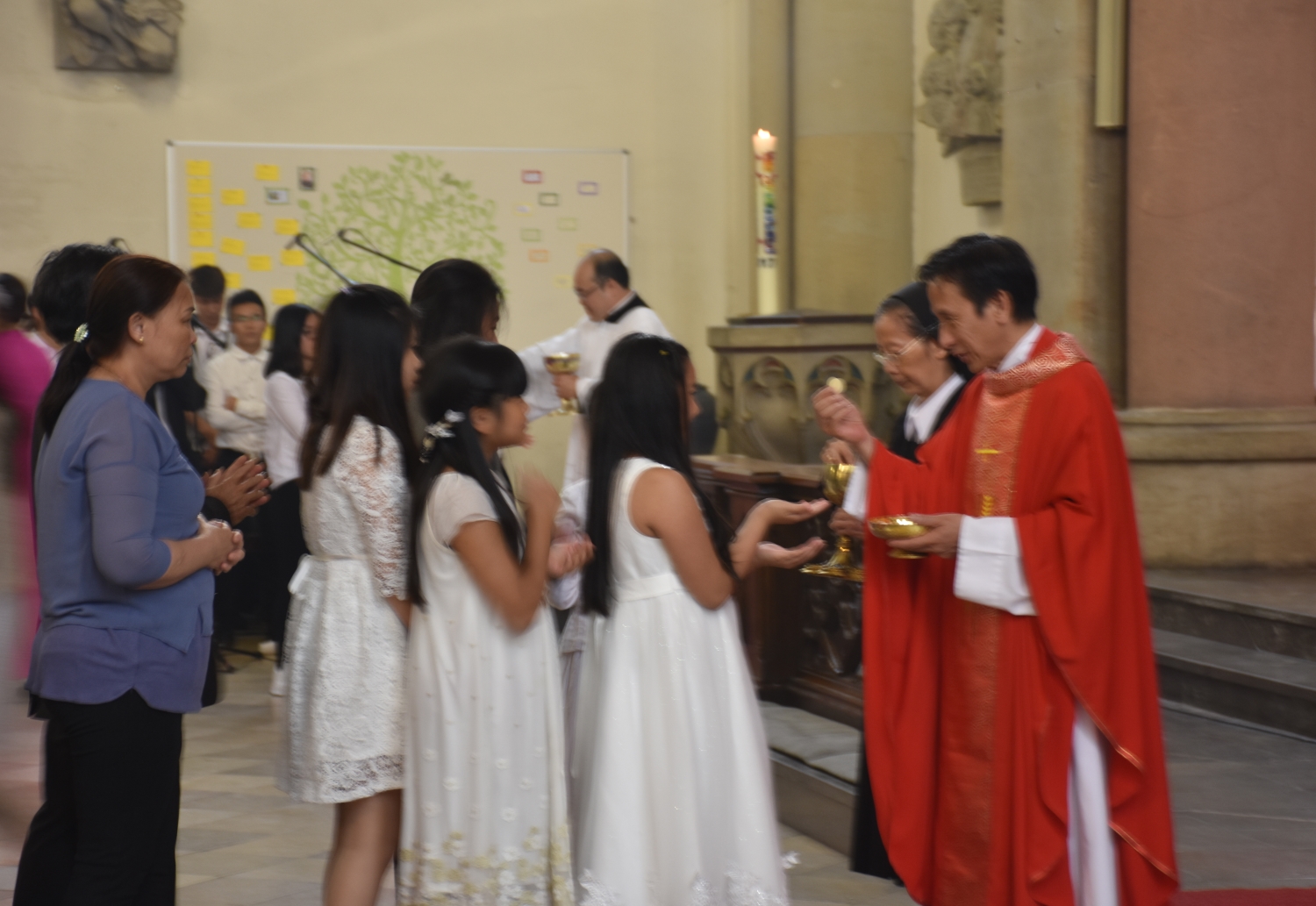 Es scheint ein wichtiges Fest für die 500 Katholiken zu sein, weshalb die Kirche sehr andächtig still ist und ansonsten nur Gebete und Lieder aus dem Gotteslob aus den Mündern der jungen Vietnamesen erklingen.
