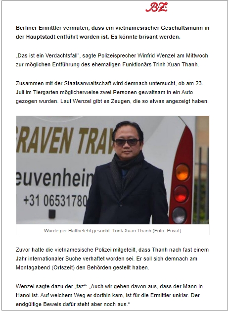 Đồng thời ngày hôm nay hàng loạt báo chí, trong đó có những tờ báo lớn tầm vóc liên bang và uy tín, thí dụ như nhật báo Süddeutsche Zeitung, tuần báo Focus, nhật báo Die Welt … đã vào cuộc, đưa tin về vụ bắt cóc Trịnh Xuân Thanh áp tải về Việt Nam: