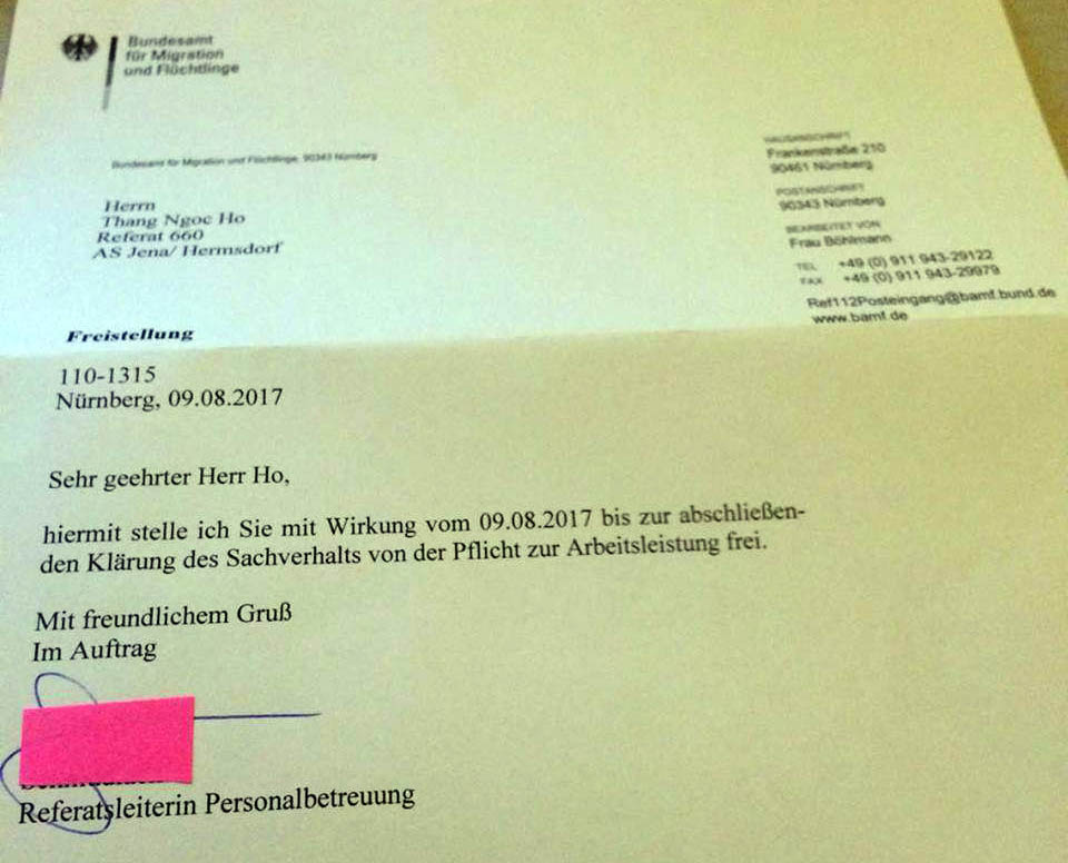 Cơ quan Liên bang Đức về nhập cư và tị nạn (BAMF) đã ra quyết định sa thải Hồ Ngọc Thắng kể từ ngày 01.09.2017, đúng 1 ngày trước Quốc khánh nước CHXHCN Việt Nam. BAMF là một cơ quan của Bộ Nội vụ Liên bang Đức. BAMF cho biết, các nhân viên đều bị ràng buộc bởi các nghĩa vụ trung thành và trung lập, nếu vi phạm thì có thể bị đuổi việc.