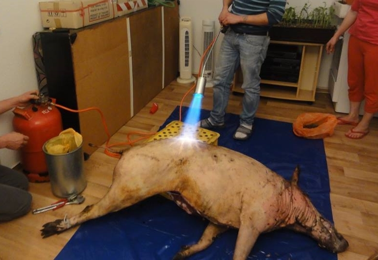Viele 11 kg-Gasflaschen mit Abflammgerät, die eigentlich für den Bau bestimmt sind, werden zum schnellsten Werkzeug, um die restlichen Haare von der Schweinehaut zu entfernen. Frauen und Kinder rufen Freudenschreie, als sie der Schlachtung in einer Berliner Plattenbauwohnung beiwohnen.