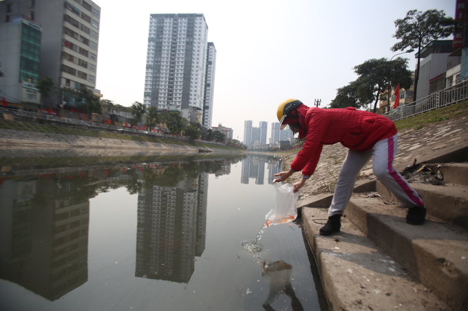 Các điểm dọc phố Khương Đình, Kim Giang, Ngã Tư Sở,… được nhiều người dân chọn là nơi thả cá chép tiễn Táo quân về trời.