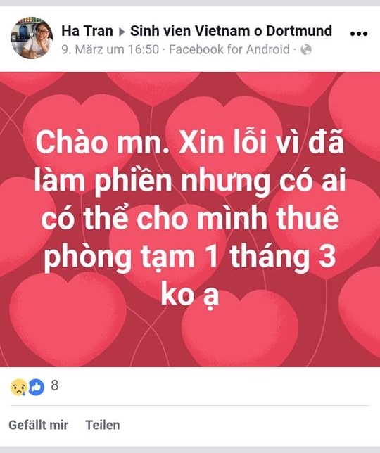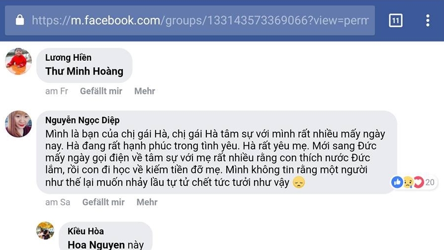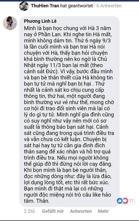 Hai ngày trước khi chết, Trần Thị Thu Hà còn viết trên Facebook của Hội sinh viên Việt Nam ở Bochum để tìm phòng thuê. Câu hỏi đặt ra, nếu Hà chán đời sắp tự tử, thì còn đi tìm thuê phòng làm chi: