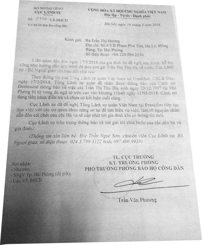 Như tờ Thoibao.de đã đưa tin về cái chết bí ẩn của một nữ sinh viên Việt Nam tại Đức. Nữ du học sinh xấu số này là cô Trần Thị Thu Hà, 21 tuổi, cựu học sinh Trường chuyên Trần Phú ở Hải Phòng. Cô là sinh viên du học ở Phần Lan từ 3 năm nay. Theo chương trình trao đổi sinh viên, ngày 07.03.2018 Trần Thị Thu Hà từ Phần Lan đã bay sang Đức và đến thành phố Dortmund, miền Tây nước Đức. Sau đó từ ngày 09.03. gia đình đã mất liên lạc với cô Hà. Ngày 15.03 cảnh sát tại Dortmund cho biết cô Hà mất vào ngày 11.03 tức là chỉ vài ngày sau khi đến Đức.