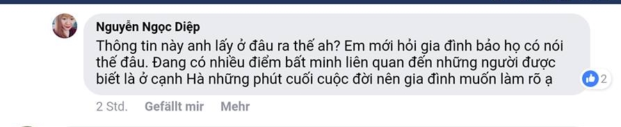 Nguyễn Ngọc Diệp, bạn gái của Hà, không tin rằng Hà „nhẩy lầu tự tử tự tử chết tức tưởi như vậy“ vì nhận thấy „Hà đang rất hạnh phúc trong tình yêu. Hà rất yêu mẹ. Mới sang Đức mấy ngày gọi điện về tâm sự với mẹ rằng con thích nước Đức lắm …“: