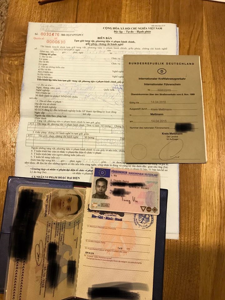 Các giấy tờ, bằng lái xe của ông Vũ Thanh Tùng – Việt kiều Đức bị thu giữ