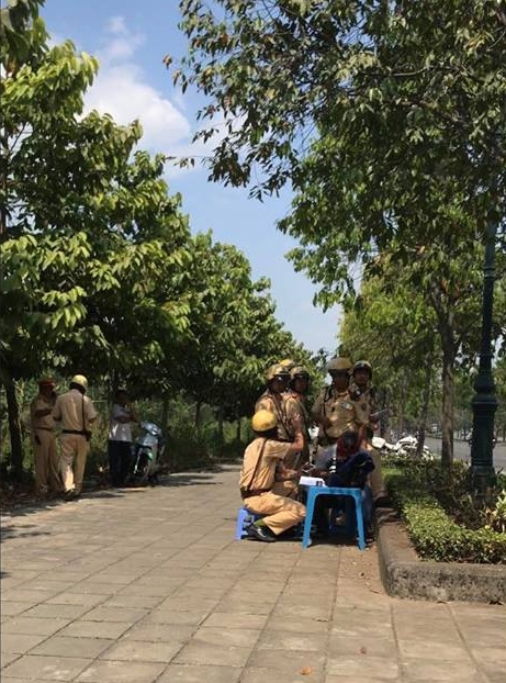 Cảnh sát giao thông Việt Nam ngồi dưới bóng cây lập biên bản ông Tùng