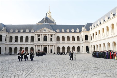 Tương tự như tình cảnh tại sân bay, tại Lễ đón chính thức ông Nguyễn Phú Trọng đã được đón theo nghi thức tối thiểu tại khu sảnh của khách sạn Les Invalides tại Paris với đội quân nhạc ít người và cũng không hề có sự hiện diện của các giới chức cấp cao của Chính phủ Pháp, điều này trái ngược với thông tin đăng tải của báo chí tại Việt Nam với ngôn từ “nhận lời mời của Tổng thống Pháp” mà không hề có sự xuất hiện của vị Tổng thống này trong Lễ đón tiếp chính thức như thông lệ về nghi lễ ngoại giao.