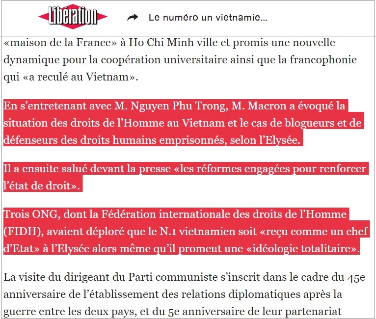 Được biết, vài ngày trước chuyến thăm Pháp của TBT Nguyễn Phú Trọng, 3 Tổ chức Nhân quyền có trụ sở tại Paris, là Liên Đoàn Quốc tế Nhân quyền (FIDH), Uỷ ban Bảo vệ Quyền Làm Người Việt Nam